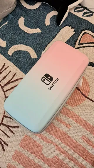 Estuche de transporte semirigido con un diseño degradado de rosa a azul claro, ideal para tu Nintendo Switch o Switch OLED. Presenta el icónico logo de Nintendo Switch. Muy poco uso, perfecto estado. Espacio para el dock, cables, cargador, joycons, cartuchos y soporte de pantalla. Material suave y agradable.