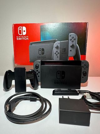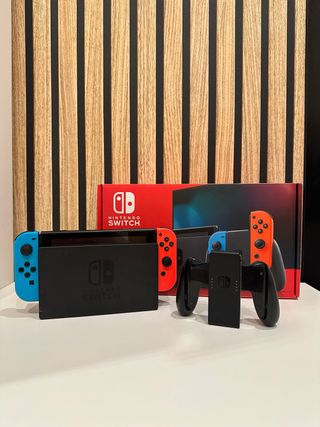 Consola Nintendo Switch con sus accesorios. - Incluye base de carga. - Dos mandos Joy-Con, uno azul y otro rojo.