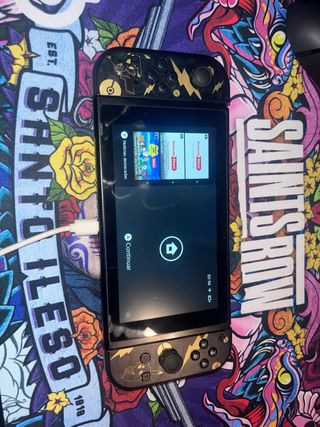 Consola Nintendo Switch con un diseño especial inspirado en Pokémon. Los Joy-Con presentan detalles dorados y siluetas de personajes. - Diseño exclusivo Pokémon. - Acabado en negro y dorado. - Precio Negociable