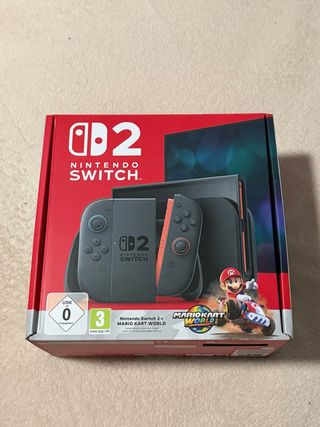 Consola Nintendo Switch 2 con el juego Mario Kart World, completamente precintada. - Incluye código de descarga del juego. - Clasificación por edades: 3 años. - Incluye Joy-Cons.