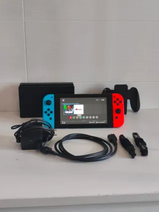 Consola Nintendo Switch en perfecto estado con accesorios, todo funciona a la perfección y no tiene ni un solo fallo. Incluye todo lo siguiente: - Consola con sus Joy-Con azules y rojos. - Base de carga original (dock para la tele). - Cargador original. - Joy-Con grip para poner los mandos cuando se juega en la tele. - HDMI. - "Tiras" para poner los Joy-Con individualmente cuando se juega en la tele. Puedo mandar un vídeo demostrando que funciona a la perfección. No bajo más el precio. Hago envíos rápidos 📦