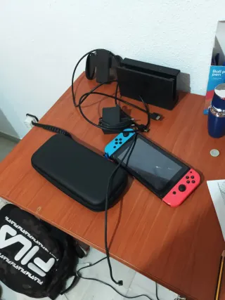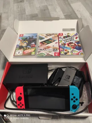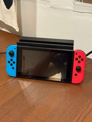 Consola Nintendo Switch V2 con Joy-Cons en azul y rojo. Incluye todos los accesorios necesarios para empezar a jugar. Lo que se ve en la pantalla es el protector despegado, NO es rotura ni nada por el estilo. - Base de carga y dock. - Adaptador de corriente. - Joy-Con Grip. - Correas para Joy-Cons. - Dos volantes para juegos de carreras. - Dos fundas para Joy-Cons (menta y rosa). - Dos fundas de joysticks. - Dock portátil (segunda foto) - Maletín para switch, mando, juegos, dock, etc. - Caja de switch. El único problema que tiene es el famoso drift, que lo tienen todas las consolas, pero se arregla facil y barato con videos.