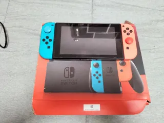 Consola Nintendo Switch en su caja original, lista para jugar. Incluye una funda protectora. - Joy-Con azules y rojos. - Base de carga. - Cables - Adaptador de corriente.