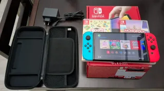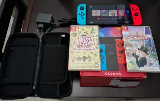 Vendo Consola Nintendo Switch OLED en color azul y rojo, junto con accesorios para tu experiencia de juego. Prácticamente nueva solo se ha utilizado la consola y solo 4 o 5 veces. Tiene protector de pantalla. Vendo xq no la utilizo. - Incluye cargador. - Estuche de transporte. - Juego Big Brain Academy: Batalla de ingenio. - Juego Monopoly para Nintendo Switch.