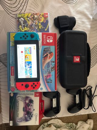 Consola Nintendo Switch en su caja con accesorios y juegos - Incluye juego Splatoon 3. -Juegos comprados que estan instalados en la consola como: Monopoly, Monopoly madness, Cuphead, hollow knight y Nintendo Sports -Accesorio para la pierna para jugar a futbol - Funda de transporte negra. - Mando Afterglow Prismatic. - Joy-Con Grip. Esta absolutamente completa con su estacion de carga y conector a TV con todos sus cables