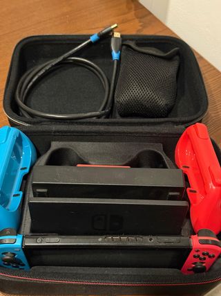 Consola Nintendo Switch con accesorios. - Incluye base de carga. - Dos mandos Joy-Con, uno azul y otro rojo. - Cable HDMI y bolsa de transporte. - incluye funda para usar cada mando individualmente