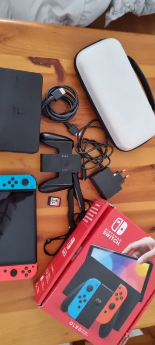 Incluye consola. - Mandos Joy-Con (izquierdo verde, derecho rosa). - Base de carga. - Cargador original Nintendo. - Cable HDMI original. - Grip para unir mandos cuando está en TV. - Correas sin usar. - Manual. - Va incluida tarjeta SD de 256 GB. - Protector de pantalla ya instalado. - La caja es de OLED pero la consola es de las primeras. - Funciona a la perfección, tanto mandos, como consola y accesorios. - Se incluyen los juegos de las fotos y algunos más de Mario y Zelda. - Precio 250, no negociable, trato en mano. - Cualquier duda, preguntar sin compromiso. Se puede entregar en Ferrol o en Santiago de Compostela. Un saludo.