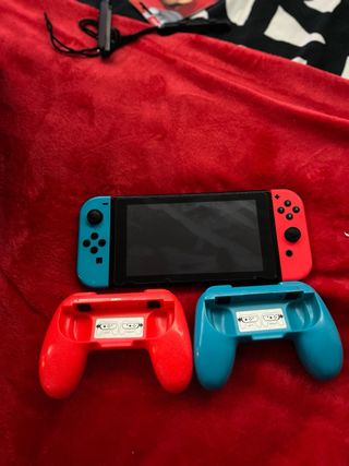 Consola Nintendo Switch con Joy-Cons en azul y rojo. - Incluye consola y mandos. - cargador - mochila de transporte nueva - base para jugar en la tv - soporte de carga para mandos - carcasa protectora En las fotos lo que se ve en la pantalla estallado es el cristal protector. La consola está perfecta Se vende por compra de Nintendo switch 2