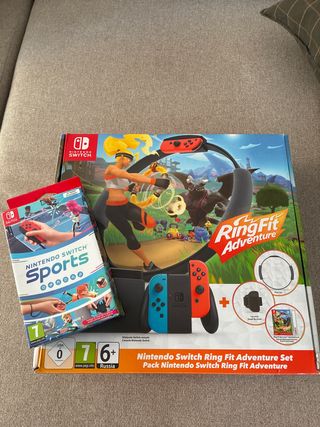 Pack de Nintendo Switch que incluye el juego Ring Fit Adventure y el juego Nintendo Switch Sports. Ideal para hacer ejercicio en casa. - Consola Nintendo Switch. - Juego Ring Fit Adventure con Ring-Con y correa para la pierna. - Juego Nintendo Switch Sports. utilizada 2 veces! NUEVA