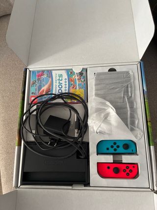 Consola Nintendo Switch edición Sports con todos sus accesorios, caja original y varios juegos más. Muy cuidada. La caja sí está algo deteriorada en sus esquinas, pero todo va en su envoltorio original: - Consola portable (pantalla con pequeño arañazo que no afecta la experiencia, ver foto) - Joy-Cons, con soporte y correas - base de carga. - cables cargador y hdmi - accesorio Sports para pierna Además, incluye varios juegos que fueron comprados, disponibles para su juego: - Nintendo Sports - Boomerang fu - Core Keeper - Hollow Knight Silksong - Dead Cells - Monster Hunter Rise El just dance y el fitness boxing son demos.
