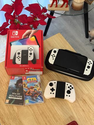 Consola Nintendo Switch OLED en color blanco. Incluye los juegos Sea of Solitude y Crash Team Racing Nitro-Fueled. - Base de carga. - Joy-Con blancos. - Funda de transporte negra.