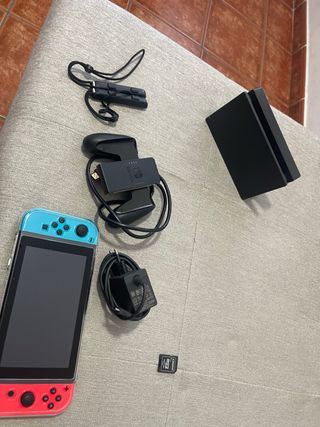 Consola Nintendo Switch con accesorios. Incluye: - Pantalla y mandos Joy-Con Azul y Rojo Oficiales Nintendo. - Soporte con agarre para Joy-Con Oficial Nintendo. - Dock Set - 4 Correas Joy-Con para muñeca -Cable HDMI para conectar a la tele - Cargador oficial Nintendo 45W. - Joy-Con (L)/(R) en rosa y verde** No oficial - Mando inalámbrico WX4 (sin cable cargador) - Pack 2 Empuñaduras para Joy-Con Azul y Rojo. - Funda de transporte negra con capacidad de hasta 19 juegos -Carcasa Pokemon Escudo (sin juego) - Tarjeta micro SD con adaptador de hasta 64GB *** IMPORTANTE*** Los Joy-Con presentan irregularidades en el drift.
