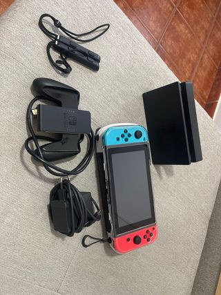 Pack de consola Nintendo Switch con poco uso, con su dock, dos joycons con su mando soporte, cables y embalaje originales y los siguientes extras: - Dos joycons extra oficiales para jugar hasta cuatro jugadores a la vez - Cargador para Joycons - Dos adaptores para los joycons para jugar en modo mando y otros dos para jugar en modo volante - Maletín de transporte oficial, incluye una funda interior para la consola - Otra funda con bolsillo y tarjetero para los juegos - Protectores para los joycons - Grips para los joysticks - Protector de pantalla nuevo a aplicar - Mando Pro opcional (el precio subiría a 270€).