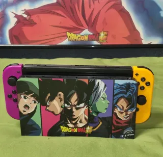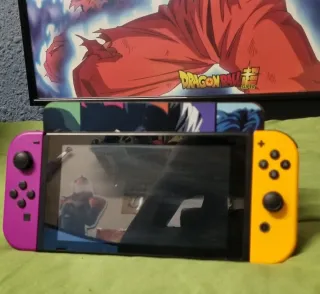 Consola Nintendo Switch con Joy-Cons en morado y amarillo. Incluye un diseño personalizado de Dragon Ball Super en la parte frontal. - Diseño exclusivo de Dragon Ball Super. - Joy-Cons de colores morado y amarillo. Contiene cable hdmi y cargador originales de la consola.
