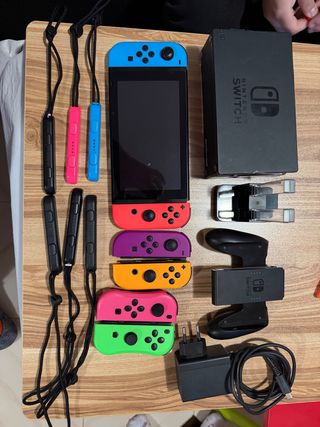 Consola Nintendo Switch en buen estado, funciona perfectamente, se entrega con: - Consola Nintendo Switch. - Joy-Cons originales azul y rosa - Joy-Cons morado y amarillo - Joy-Cons verde y rosa - Base de carga para 4 Joy-Cons. - Agarre para Joy-Cons. - Cargador de corriente.