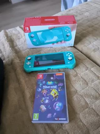 Consola portátil Nintendo Switch Lite en color azul. - Incorpora juego de Bob esponja Cósmic Shake y protector de goma azul a juego con la consola. - Diseño compacto y ligero. - Pantalla táctil de 5.5 pulgadas. - Controles integrados a ambos lados.