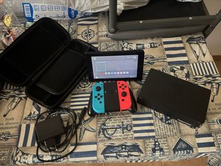 Consola Nintendo Switch con sus accesorios. - Base de carga. - Pantalla. - Joy-Con azules y rojos. - Correas para Joy-Con. NEGOCIABLE