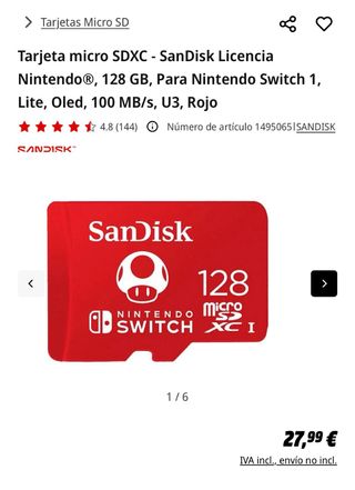 🤝 Recoger en San Fernando o envio. 📦 Envío: Solo SEUR o InPost (❌ no elija correos). 🚫 Precio NO negociable. ⭐ Vendedor de confianza: +200 valoraciones positivas. Tarjeta de memoria SanDisk de 128 GB, diseñada para cualquier Nintendo Switch, además, compatible como ordenadores, teléfonos, tablet e, etc.. - Capacidad: 128 GB - Velocidad de lectura: 100 MB/s - Clase de velocidad: U3 - Color: Rojo