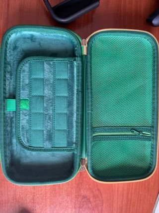 Funda protectora para Nintendo Switch con diseño inspirado en Zelda. Es ligera y fácil de transportar. - Diseño temático de Zelda. - Cierre de cremallera. - Asa de transporte. - Protector de silicona negro que mejora el agarre. Hace de grip y protege. Incluyo protector de pantalla de cristal templado. Todo nuevo, no se ha llegado a usar por cambiar los joy con.