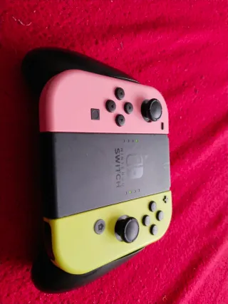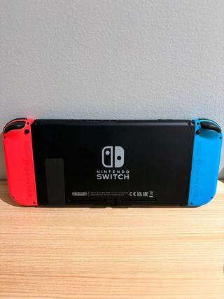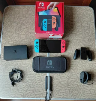 Consola Nintendo Switch OLED con Joy-Cons en azul y rojo. Incluye todos los accesorios originales y de regalo una funda para guardarla. Incluye: - Nintendo Switch - Base de carga para Nintendo Switch. - Joy-Con Grip. - Cable HDMI. - Adaptador de corriente. - Cable de carga - Funda para guardarla
