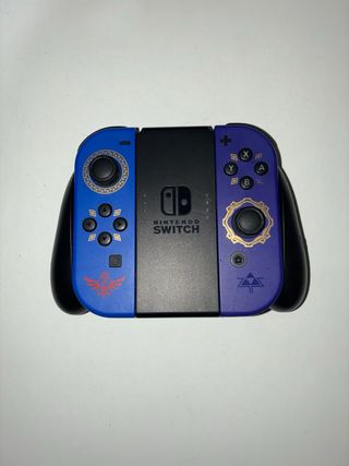 Mandos Joy-Con para Nintendo Switch con diseño especial de Zelda. - Color azul y morado. - Detalles dorados y símbolos de The Legend of Zelda. - Incluye agarre para mando.