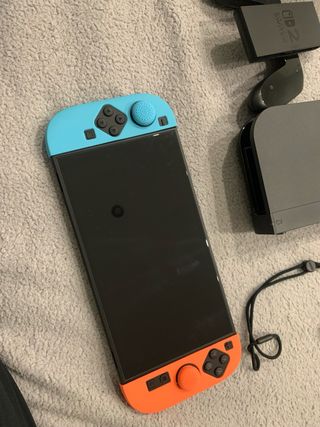 Consola Nintendo Switch con accesorios. - Color azul y naranja. - Incluye correa. - Incluye base de carga.