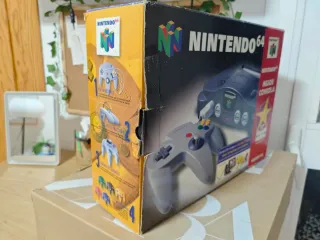 Consola Nintendo 64 en color gris, con su mando original, sus papeles y transformador etcétera. Caja con desaste pero bien conservada y corcho bastante bien. Funcionando correctamente.