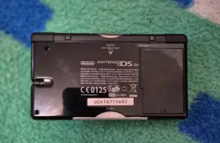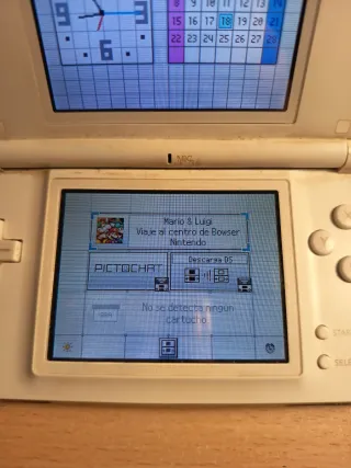 Consola portátil Nintendo DS Lite en color negro. - Pantalla superior con calendario y reloj. - Pantalla inferior con menú de juegos y aplicaciones. - Botones de control direccional y botones A, B, X, Y.