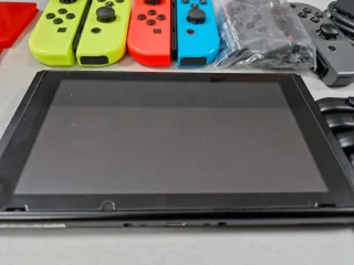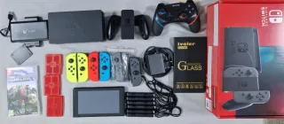 Superpack de consola Nintendo Switch con accesorios, compuesto por: - Consola (en perfecto estado, con cristal templado puesto) y accesorios básicos (cargador original, soporte para TV y soporte mandos) - Caja original. - 2 parejas de joycons (amarillos y rojo/azul) y otra pareja de mandos grises (uno para piezas) - Mando Pro. - Micro SD de 128 GB - Juego Minecraft - Batería externa (con adaptador para acoplarla a la consola) - Funda de transporte grande, para consola y accesorios. - Cargador para coche - Cristal templado de repuesto. Todo funciona. Los joycons presentan desgaste externo. Precio negociable. Dudas, preguntar.