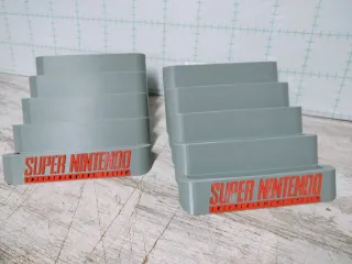 Soporte expositor para juegos de Super Nintendo. - Diseño escalonado para mostrar varios cartuchos. - Acabado en color gris. - Inscripción SUPER NINTENDO ENTERTAINMENT SYSTEM en color naranja.