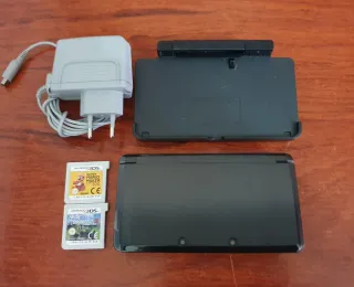 Consola Nintendo 3DS en color negro para reparar o piezas. Hace contacto al ponerla al cargar pero se apaga. - Incluye cargador. - Incluye base de carga. - Incluye dos juegos: Super Mario Maker 3DS y Farming Simulator 2012.