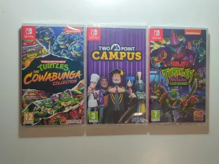 Se venden tres videojuegos para Nintendo Switch región ESP. - Teenage Mutant Ninja Turtles: The Cowabunga Collection - Two Point Campus - Teenage Mutant Ninja Turtles: Mutantes Desencadenados Los 3 juegos con la carátula en castellano. Tortugas ninja
