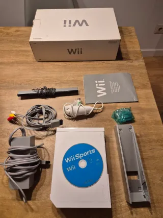 Consola Nintendo Wii en color blanco, con el juego Wii Sports incluido. - Incluye consola, mando nunchuk, sensor bar, cableado y fuente de alimentación. - Disco de juego Wii Sports. - Sin mando principal - Todo en su caja original