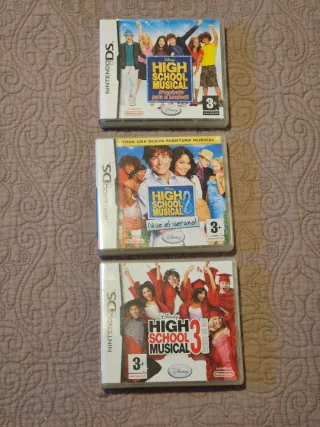 Tres videojuegos para Nintendo DS de la saga High School Musical. - High School Musical: ¡Atrévete a cantar! - High School Musical 2: ¡Vive el verano! - High School Musical 3: ¡Saca el curso!