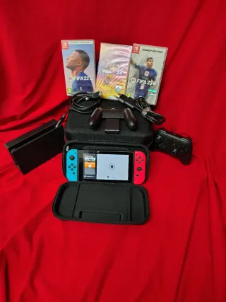 Consola Nintendo Switch con Joy-Cons en azul y rojo, lista para jugar. Incluye accesorios y juegos. - Nintendo Switch con Joy-Cons azul y rojo. ( A este le falta la gomita, pero funciona perfectamente) - Base de carga. - Mando Pro Controller. - Funda de transporte. - Juegos: FIFA 22 Legacy Edition, NBA 2K24, FIFA 23 Legacy Edition.