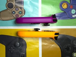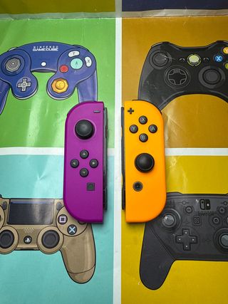 Par de Joy-Con para Nintendo Switch en colores morado y naranja. - Joy-Con izquierdo en color morado tiene un desgaste por la parte trasera - Joy-Con derecho en color amarillo