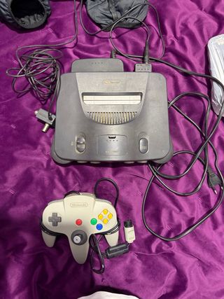 Consola de videojuegos clásica Nintendo 64 en color gris, con su mando original. - Incluye consola y mando. - Cableado necesario para conexión.
