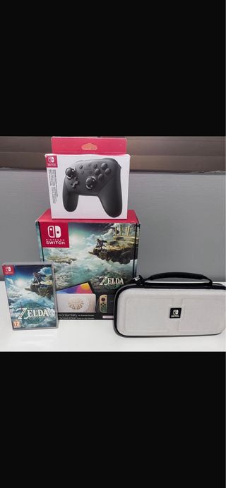 Consola Nintendo Switch OLED edición zelda, junto con accesorios y juegos. - Mando Pro Controller.(original) - Funda de transporte gris. - Juego: The Legend of Zelda: Tears of the Kingdom. - Juego : Mariokart 8 deluxe La consola y el resto de accesorios están impecables (muy poco uso) todos los componentes originales y perfectamente cuidados. El precio es por pack completo