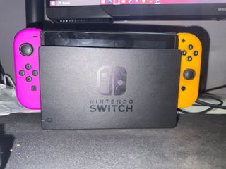 Consola Nintendo Switch con Joy-Cons en llamativos colores naranja y rosa. - Incluye la consola. - Dos Joy-Cons (uno naranja, uno rosa). - Base de carga - Animal Crossing
