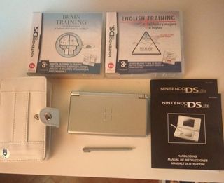 Consola Nintendo DS Lite en color plateado, lista para horas de diversión. - Incluye funda protectora blanca. - Cargador original. - Dos juegos: Brain Training y English Training. - Lápiz táctil. Apenas usado Sólo entrego en mano.