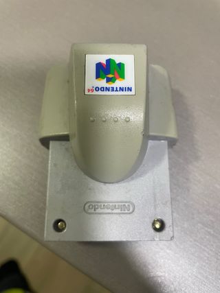 Adaptador para Nintendo 64 en color beige y plateado. - Incluye el logo de Nintendo 64. - Detalle del logo de Nintendo en la base.
