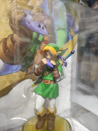 Figura Amiibo de Link de The Legend of Zelda: Ocarina of Time. - Figura de Link con su traje verde característico. - Base dorada para exhibición. - Parte de la colección Amiibo de Nintendo.