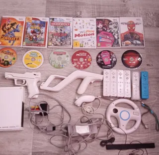 Lote de consola Nintendo Wii en color blanco, junto con varios accesorios y juegos, la wii tiene la tapa de los mandos de gamecube rota. - Incluye consola Wii. - Incluye 6 mandos Wii Remote y 1 Nunchuk. - Incluye pistola Wii Zapper. - Incluye volante Wii. - Incluye pistola Wii. - Incluye juegos: Gormiti, Mario Tennis, Monopoly Streets, Wii Play Motion, Monster High, Spider-Man. - Incluye cables y adaptadores.