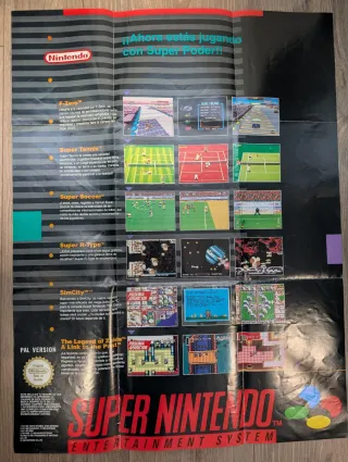 Panfleto original de instalación para la consola Super Nintendo. - Incluye información sobre juegos como F-Zero, Super Tennis, Super Soccer, Super R-Type, SimCity y The Legend of Zelda: A Link to the Past. - Presenta gráficos y descripciones de los juegos. - Muestra el sello de calidad original de Nintendo. #snes #nes #retro