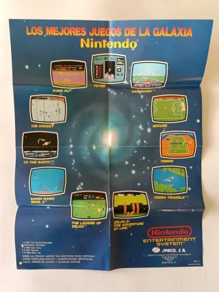 Póster promocional de la Nintendo Entertainment System con Los Mejores Juegos de la Galaxia. - Incluye ilustraciones de juegos como Kung Fu, Tetris, Rad Racer, Ice Hockey, Soccer, To The Earth, Tennis, Super Mario Bros. 2, Cobra Triangle, The Legend of Zelda y Zelda II: The Adventure of Link. - Diseño con temática espacial. - Información de copyright y distribuidor en España. En perfecto estado. Más artículos similares en mi perfil.