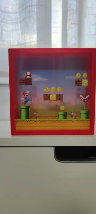 Hucha con diseño inspirado en el universo de Mario Bros. - Personaje de Mario en acción. - Elementos clásicos del juego como tuberías y bloques. - Incluye monedas y un Goomba.