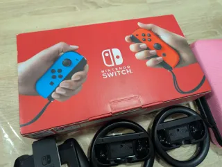 Consola Nintendo Switch con todos sus accesorios originales. - Incluye dos Joy-Cons en rojo y otros dos en gris. - Mando Pro Controller bicolor (verde y rosa). - Base de carga para la nintendo. - Cable de HDMI. - Cargador. - Soporte para la consola. - Tres accesorios para jugar con los mandos individualmente.