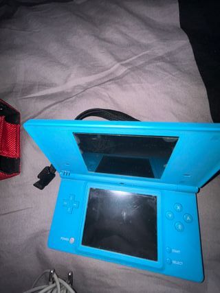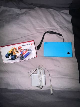 Consola portátil Nintendo DSi en color azul. La pantalla está en perfecto estado, lo que se ve son protectores que se pusieron cuando se compró nueva. Incluye el correa de wii, cargador original y una carcasa temática de Mario Kart 7. - Carcasa con diseño de Mario Kart 7. - Cargador incluido.