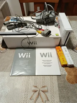 Consola Nintendo Wii en color blanco, lista para horas de diversión. Incluye todos los cables y manuales necesarios para su configuración e instalación. - Sensor Wii. - Cable de alimentación. - Cable AV con conexiones RCA (amarillo, rojo, blanco). - Manual de instrucciones en español, portugués e italiano. - Mando Wii Remote y Nunchuk (colores aleatorios). - Base para la consola. Incluye 5 juegos: -Juego La voz con dos micrófonos de regalo. - Juego Mario Kart con volante original de regalo. -Juego Mario Bross. -Juego Bomberman Land. -Juego Wii Sports.