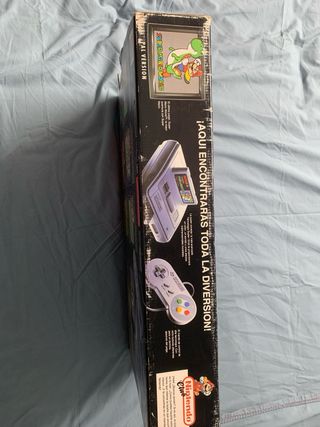 Caja original para la consola Super Nintendo Entertainment System (SNES) PAL. Comprada cuando salio, unico propietario - Diseño con Tecnología Super 16-Bit. - Incluye imagen de la consola y mando. - Ilustraciones de Mario y Luigi.